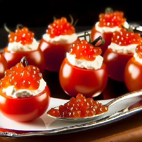 - Topping with Caviar: Carefully place a small amount of Siberian Sturgeon Caviar on top of the cream cheese in each tomato. The caviar should be the final layer, adding a visually appealing and flavorful finish to the appetizer.