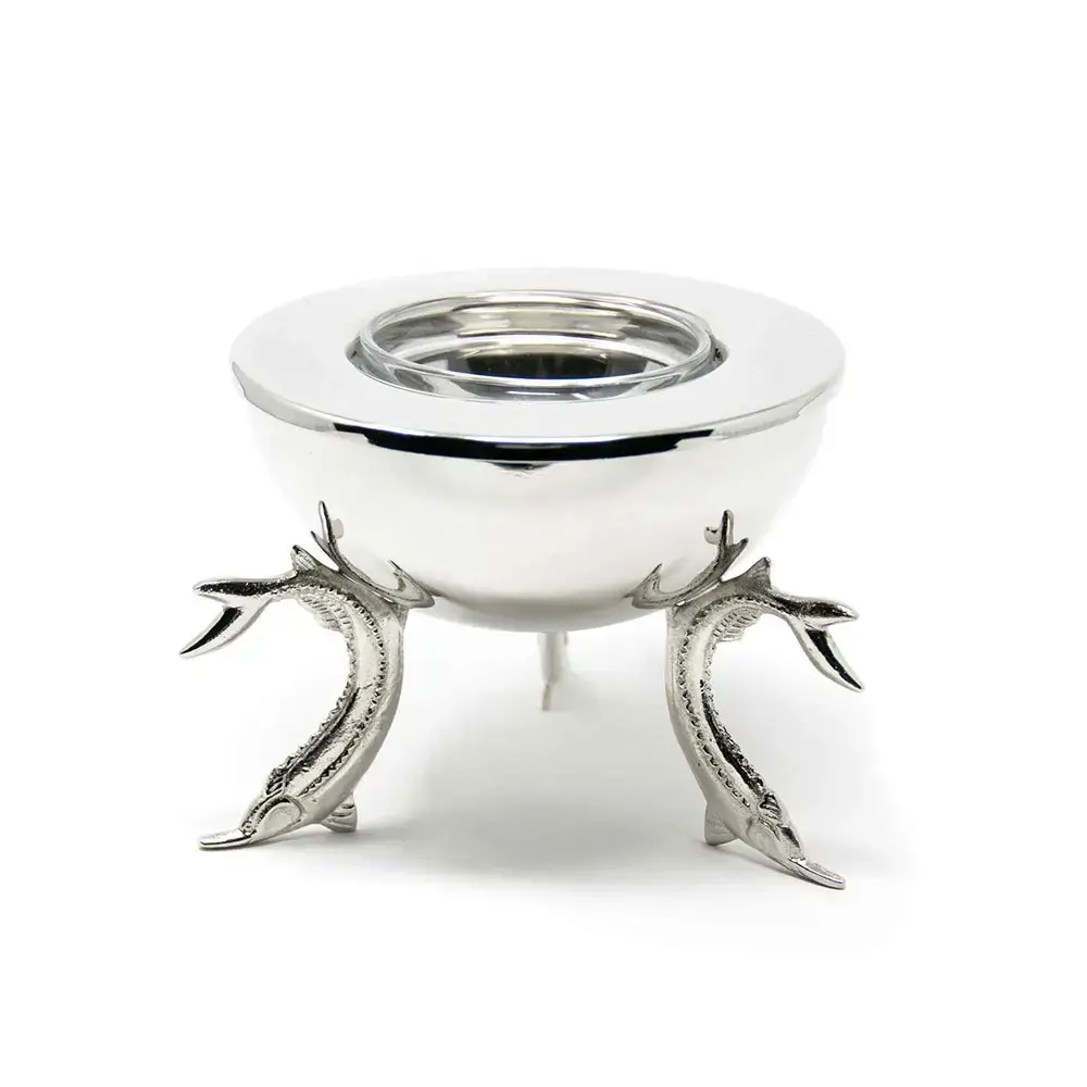 Presenting a sophisticated server adorned with sturgeon accents, designed to maintain the optimal temperature of your caviar for an extended duration without condensation, all thanks to its double-walled construction.