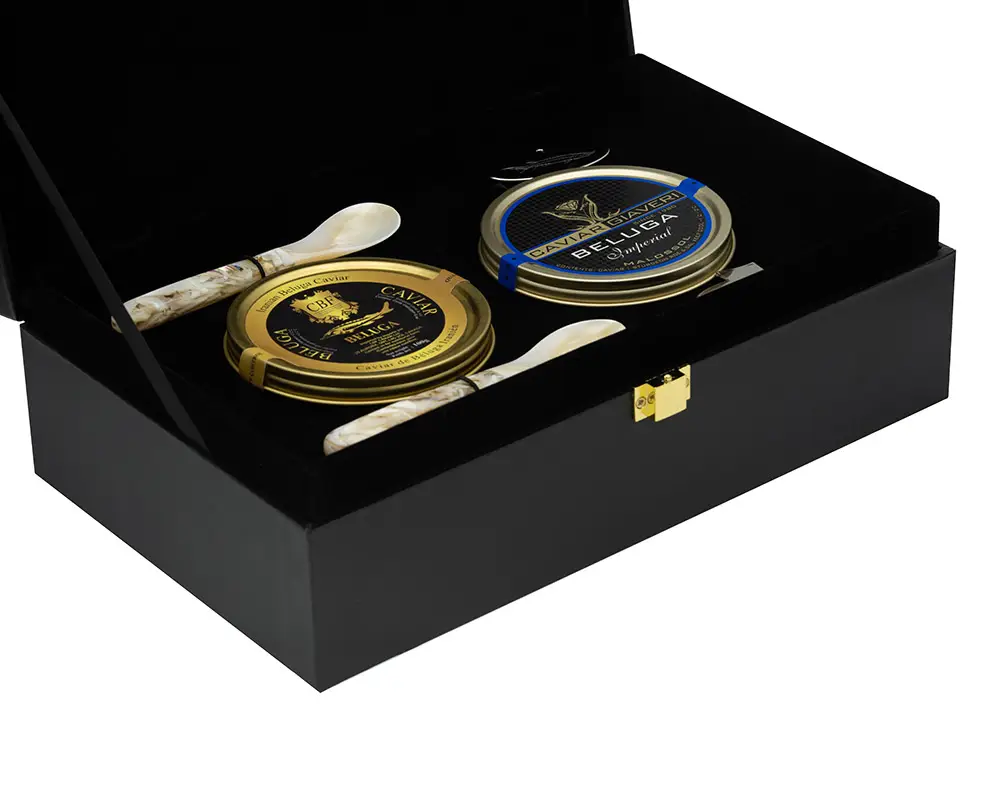 Introducing the “King of Kings” Gift Box—an opulent treasure trove that transcends the boundaries of culinary excellence. Within this regal ensemble, the union of Iranian and Italian Beluga Caviar reigns supreme, embodying the pinnacle of gastronomic luxury. The Iranian Beluga Caviar, renowned for its grandeur and unrivaled elegance, boasts colossal, glossy pearls that melt like liquid silk on the tongue, exuding an exquisite fusion of oceanic essence and sophistication. Meanwhile, the Italian Beluga Caviar adds its own aristocratic charm, with plump, glistening spheres that tantalize the senses, offering a delightful interplay of briny depth and delicate nuances.