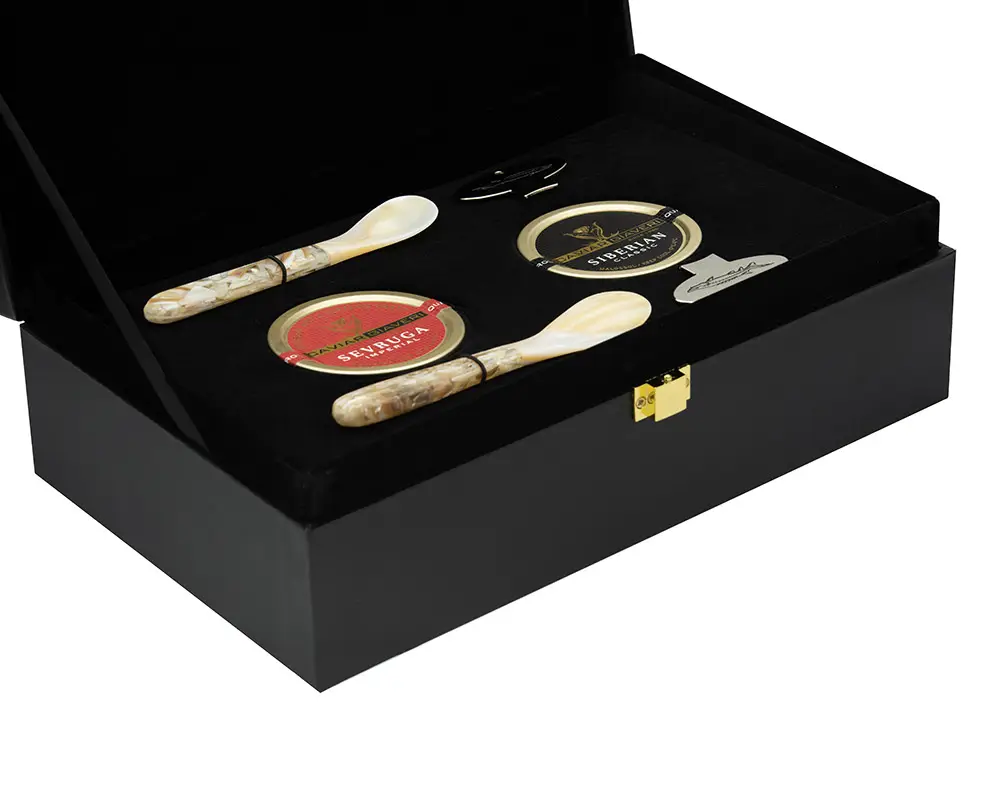 Indulge in the harmonious symphony of flavors and textures with our Caviar Gift Box, featuring the exquisite pairing of Siberian and Sevruga caviar. This culinary masterpiece takes you on a journey through the world of caviar, where the Siberian caviar delights with its silky, medium-sized pearls and a delicate, nutty essence that captures the essence of the Siberian sturgeon. Meanwhile, the Sevruga caviar enchants with its smaller, glossy beads and a bold, briny flavor profile that carries the unmistakable mark of the Caspian Sea.